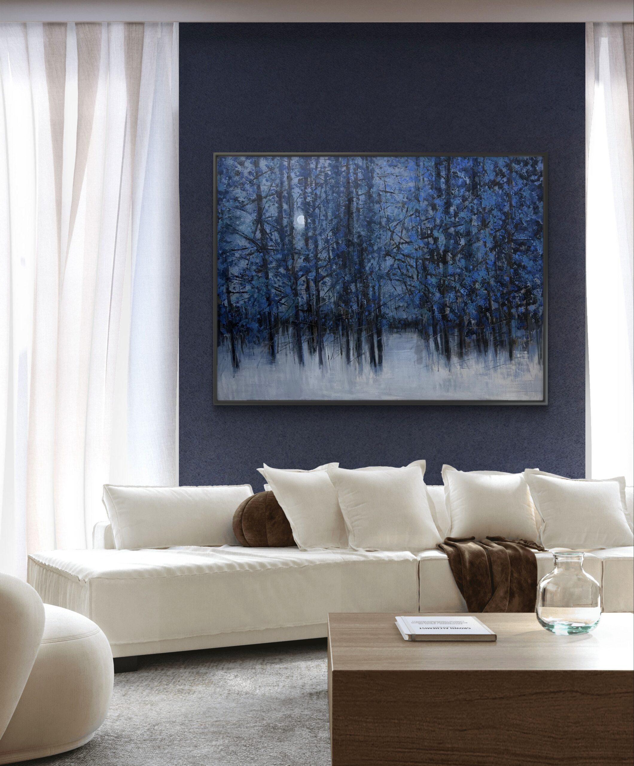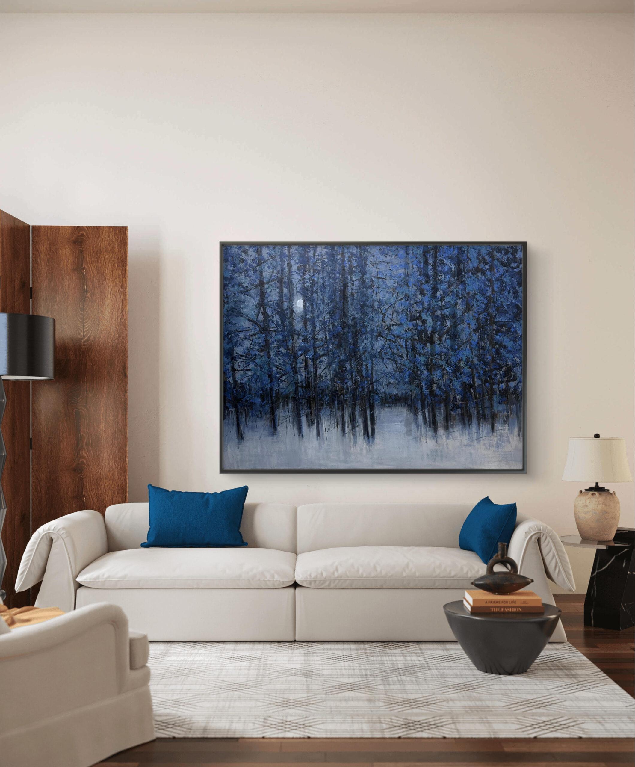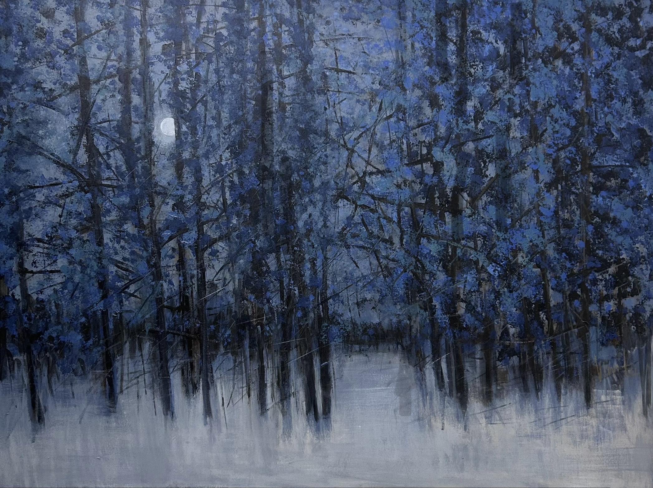 Right from the start, I saw a moon in white. I tried giving it other shades, but no matter what I did, it kept finding its way back—like it had been quietly listening to me all along. This painting captures a forest under a night sky. The trees stand tall, their dark branches layered with cool tones of blue, and the ground fades softly into white. Amid it all, the moon glows gently—just the way I imagined—soft, still, and present.