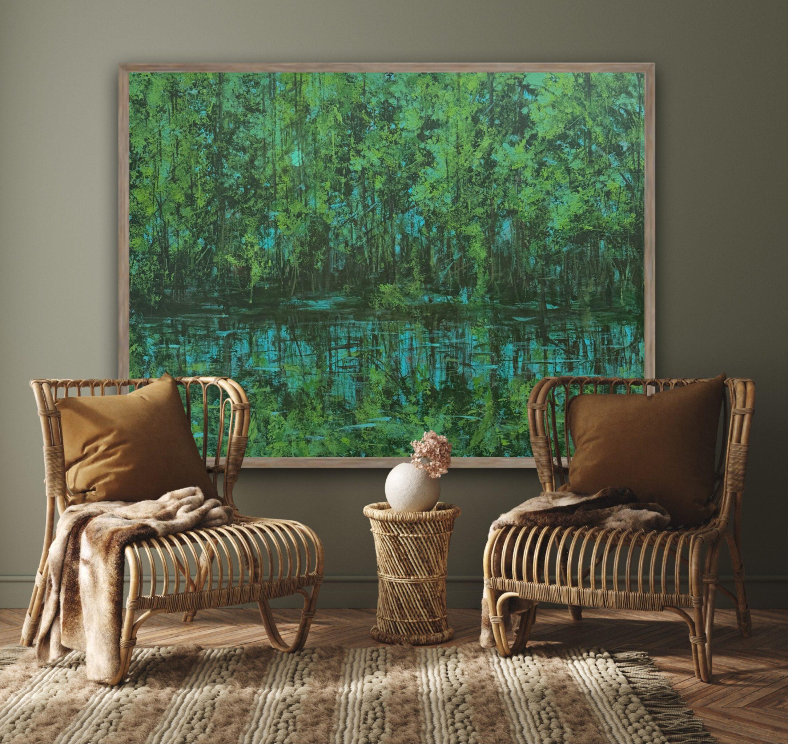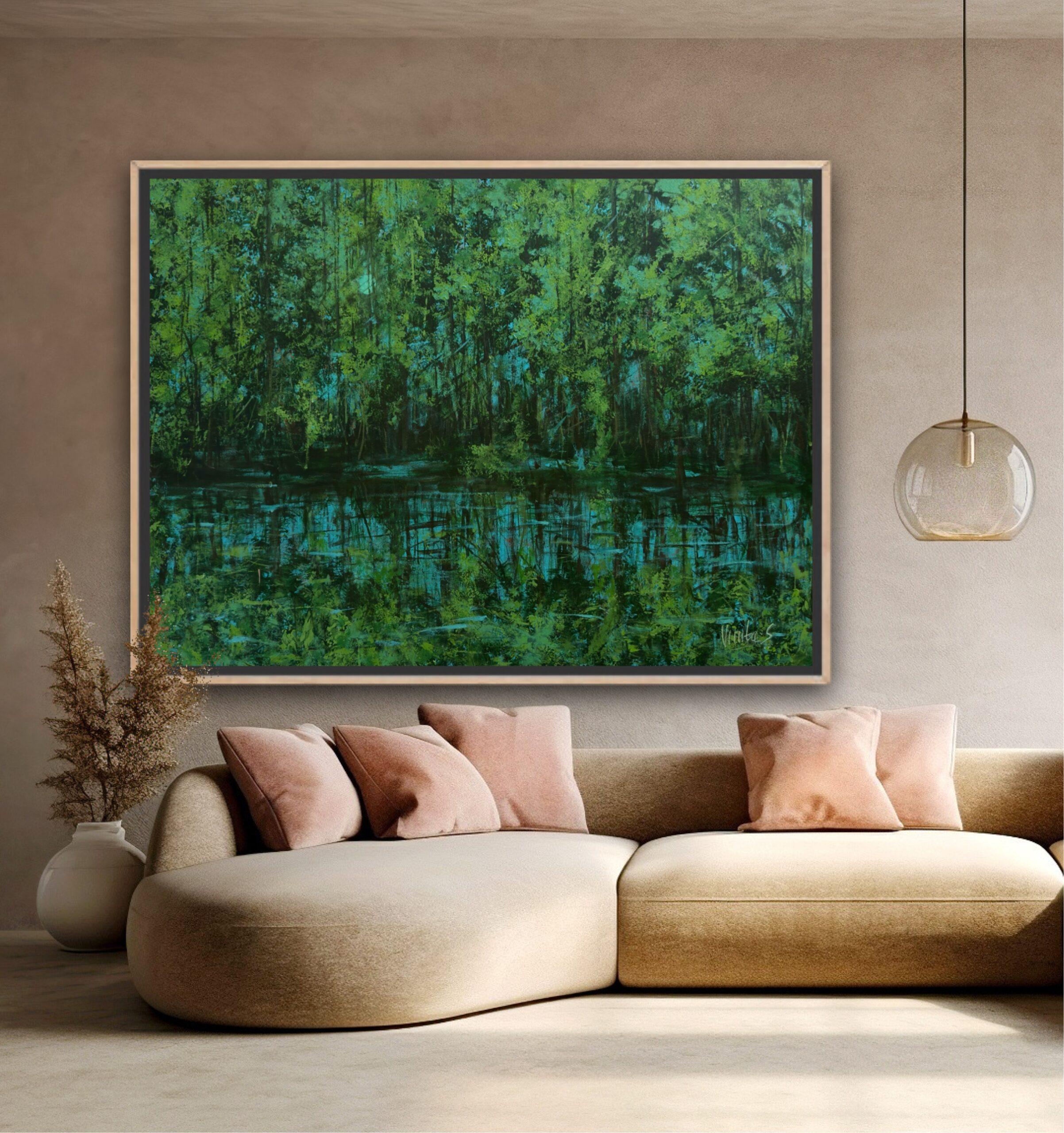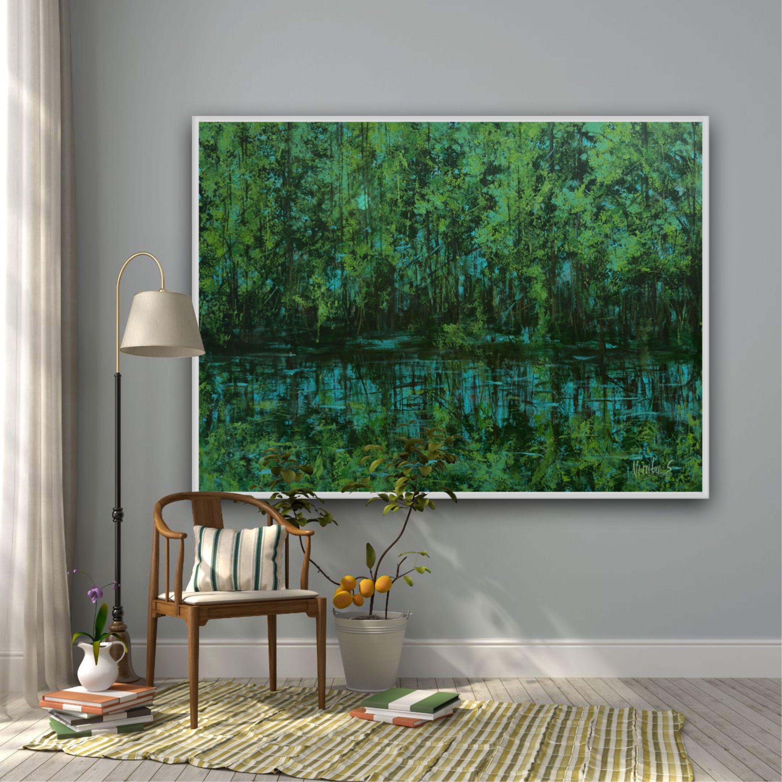 Immerse yourself in the tranquil beauty of “Shri Vanam,” a contemporary abstract landscape that speaks of abundance and serene growth. This medium-sized acrylic painting on canvas is rich with lush forest greens and deep blues, creating a textured surface where light dances and plays. The artwork evokes the essence of a sacred forest, a place of quiet grace and natural splendor.