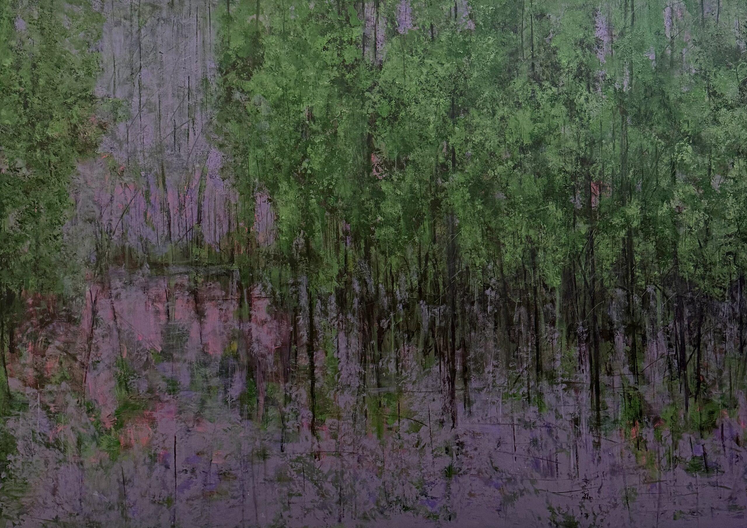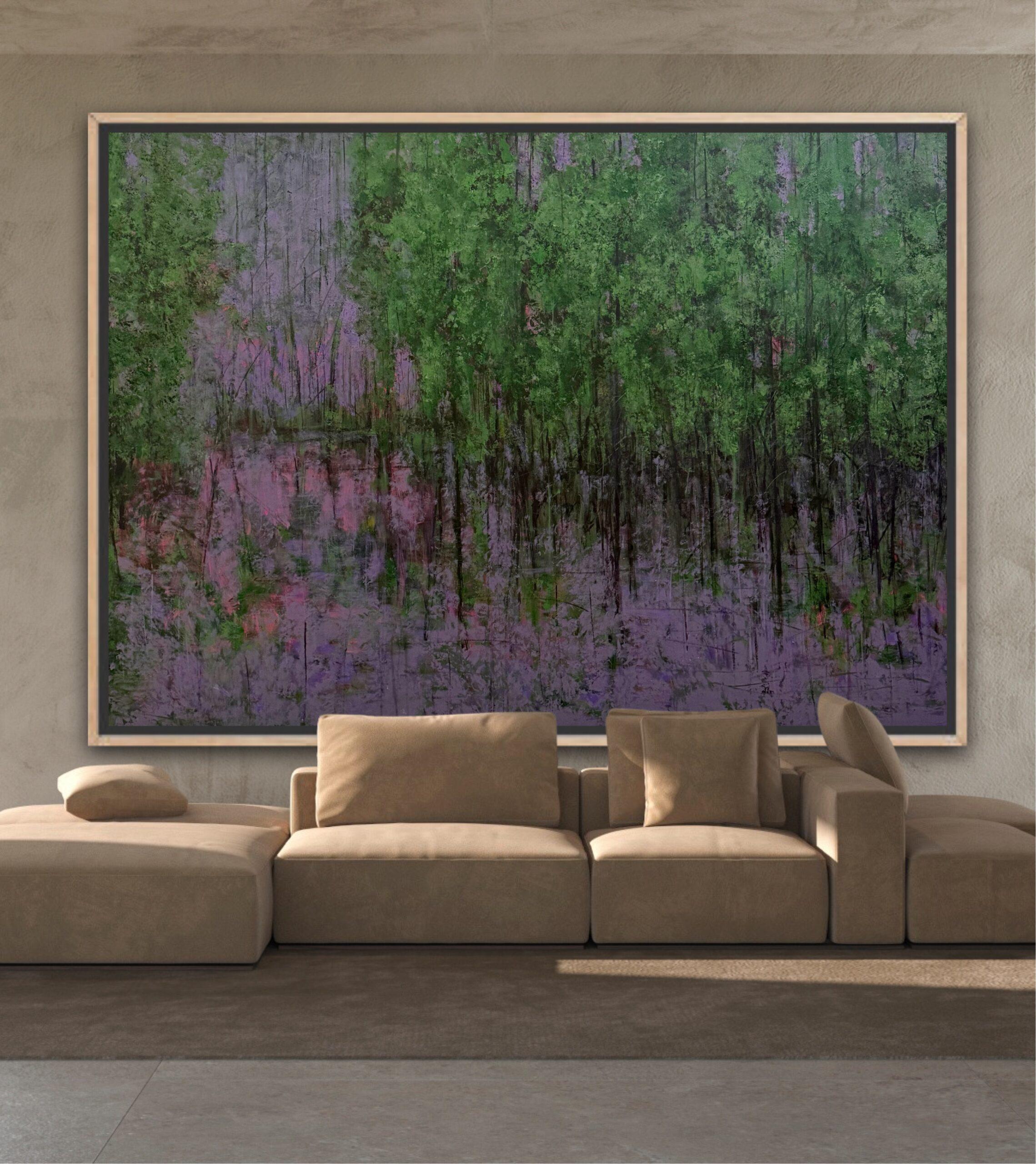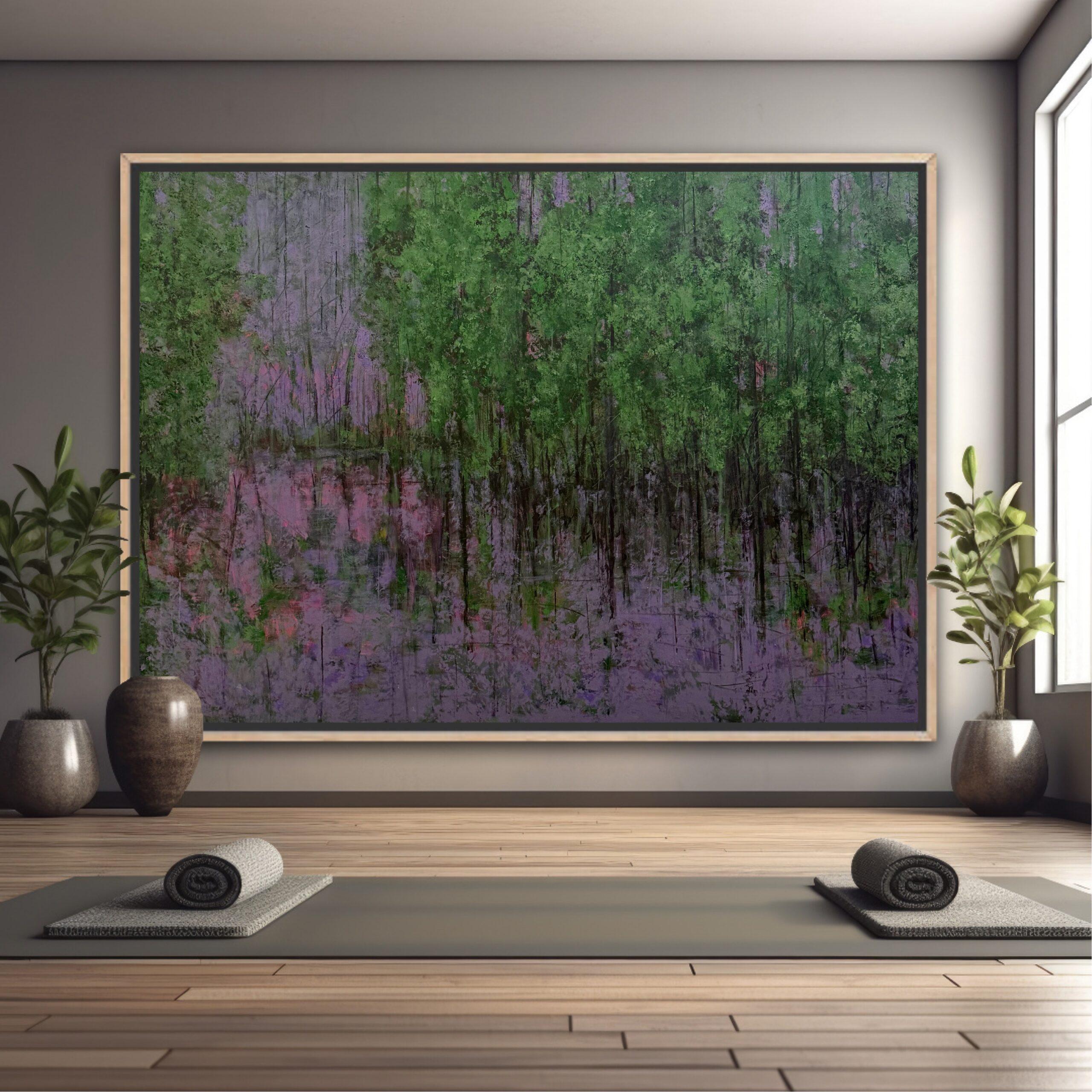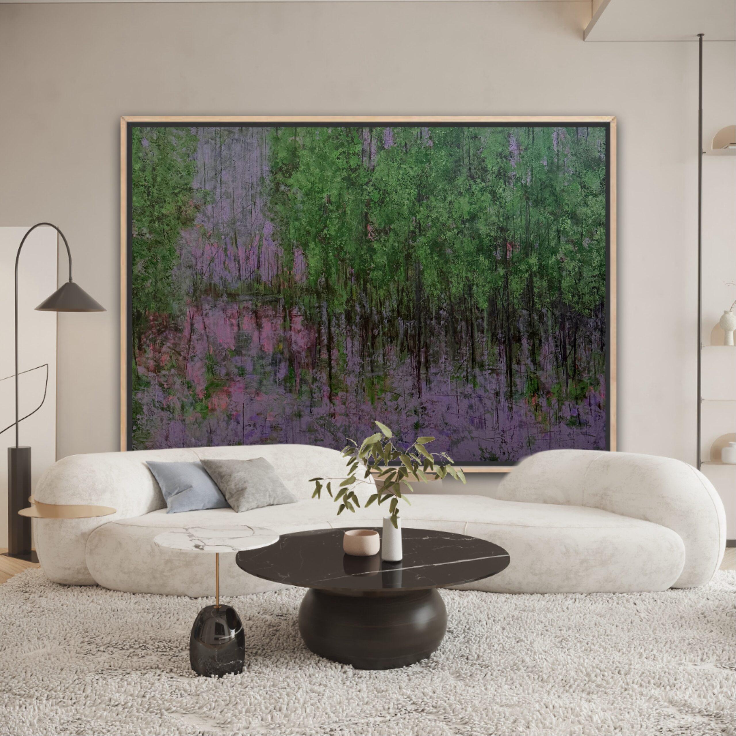 A forest held in fulness. Lush greens, soft lilac reflections, and a silence that feels complete. A gentle reminder that sometimes abundance is simply the feeling of nothing missing. Nature-inspired statement piece that transforms your space into a sanctuary of stillness and elegance.